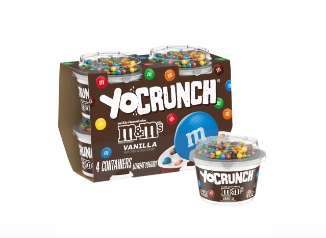 The article says the M&Ms version of Yo Crunch contains 26 g of sugar, and that all but six of those grams are added sugar. It also states there is 5 g of protein per serving.